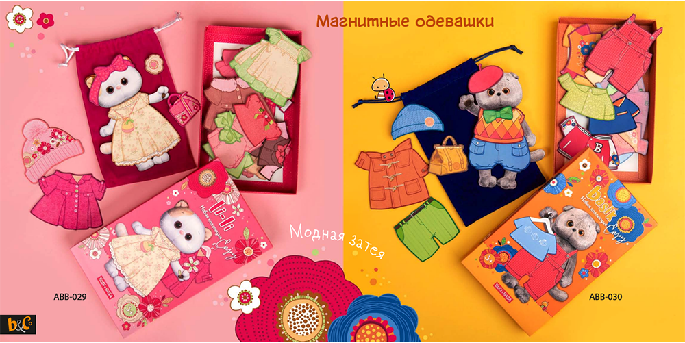 Магнитная фигура кота Басика и его подруги Ли-Ли + разнообразные предметы одежды для героев. Сколько случаев, столько и подходящих образов, которые кот Басик и Ли-Ли с удовольствием примеритят! Размер каждой коробки 22,5×13,5×2,5 см.